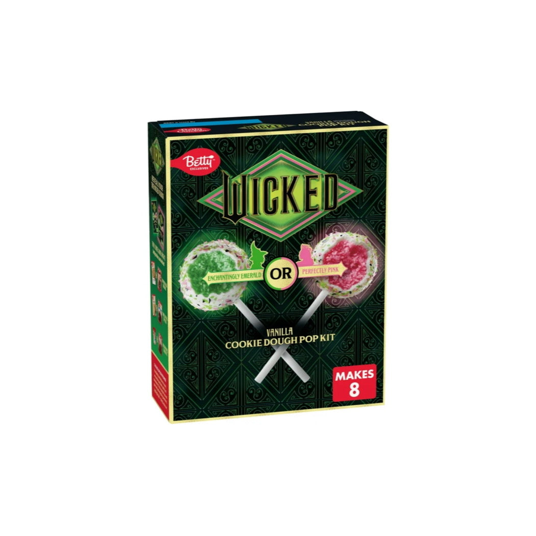 Inspired by the movie Wicked: For Good, this kit creates spellbinding, color-changing cookie dough pops in Enchantingly Emerald or Perfectly Pink hues. See which color your mix will reveal! This kit includes color-changing cookie dough mix, white melting wafers, edible glitter, and sticks. By following the simple steps on the package, you can craft these delicious treats for a Wicked themed party, dessert, office or kids snacks, or any gravity-defying moment. Can't wait to bake? Cookie dough pops are safe to eat raw because we use heat treated flour. Conjure up a batch of Betty Crocker Wicked For Good cookie dough pops and bring the magic of Glinda, Elphaba, and Oz to everyday life, one bewitching bake at a time. Makes eight cookie dough pops.