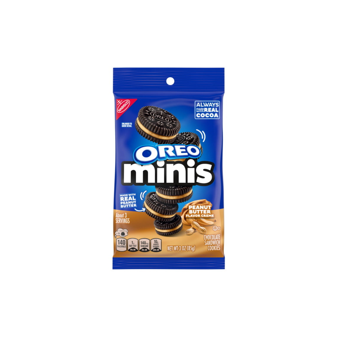 Oreo Peanut Butter Mini’s: Crunchy bite-sized Oreo cookies filled with smooth peanut butter crème. A deliciously portable snack that combines the classic Oreo crunch with a nutty twist.