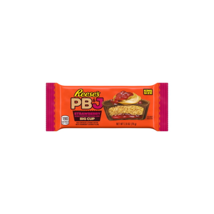 Indulge in the perfect combination of creamy peanut butter and tangy strawberry jam with Reese's PB&J Strawberry Big Cup King Size. Enjoy 79 grams of deliciousness with every bite. Made in America with high-quality ingredients, this sweet and savory treat is perfect for satisfying any craving.